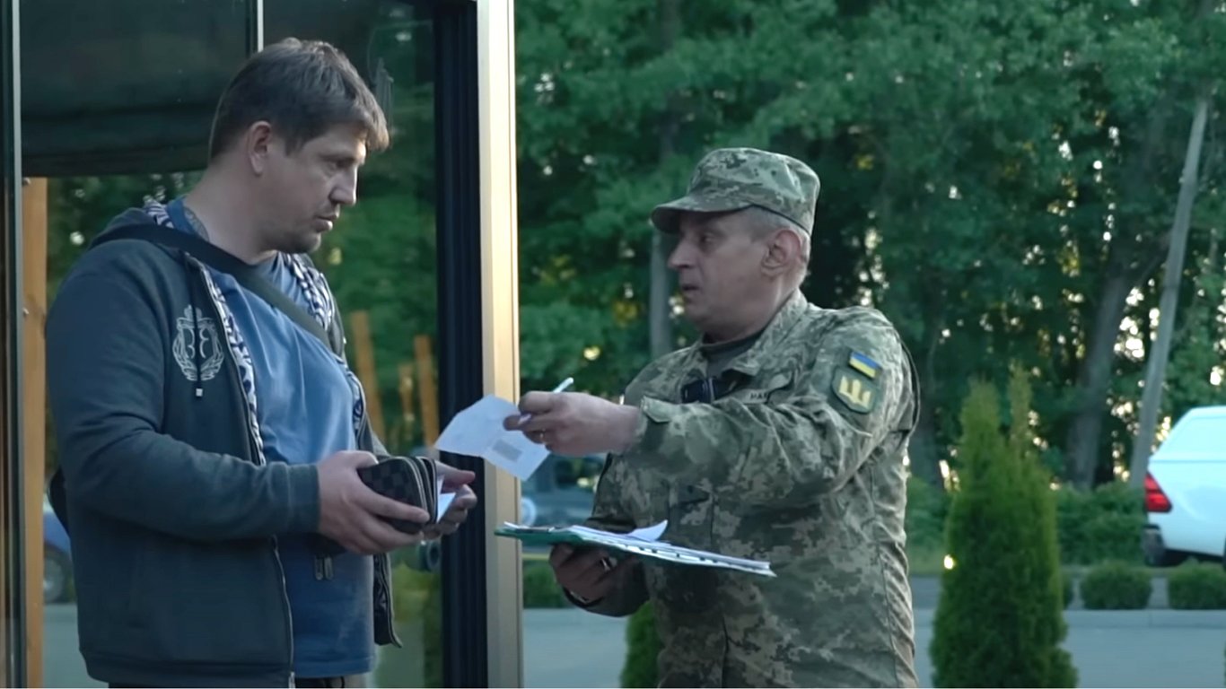 Працівники ТЦК виписують повістку військовозобов'язаному. Скриншот з відео на Youtube
