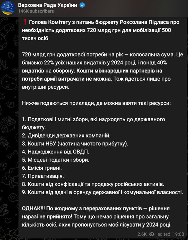 'post': <Post: Глава Комитета по бюджету Пидласа назвала пути получения средств для финансирования мобилизации>,