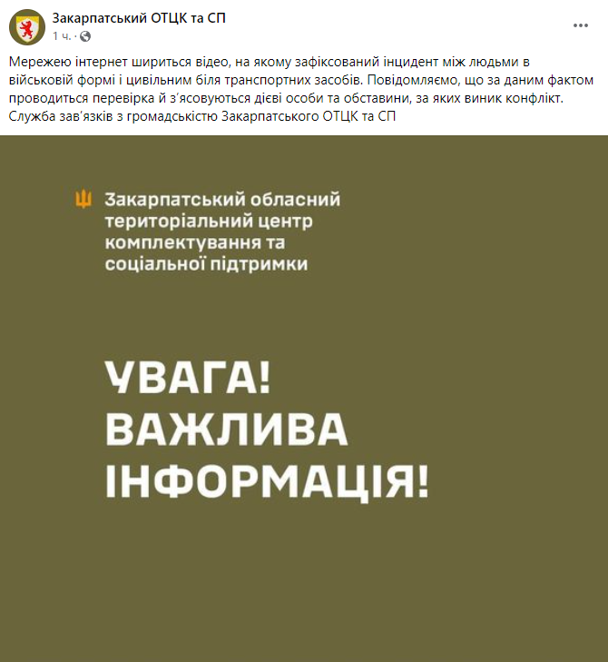 Закарпатский областной ТЦК уже опубликовал свой ответ на Facebook. В нем они сообщили, что сейчас ведется расследование по установлению лиц, причастных к происшествию, и обстоятельств, приведших к конфликту.
