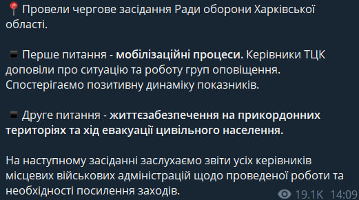 "Первый вопрос — мобилизационные процессы. Руководители ТЦК доложили о ситуации и работе групп оповещения. Наблюдаем положительную динамику показателей. Второй вопрос — жизнеобеспечение на приграничных территориях и ход эвакуации гражданского населения", — отметил глава Харьковской ОВА.