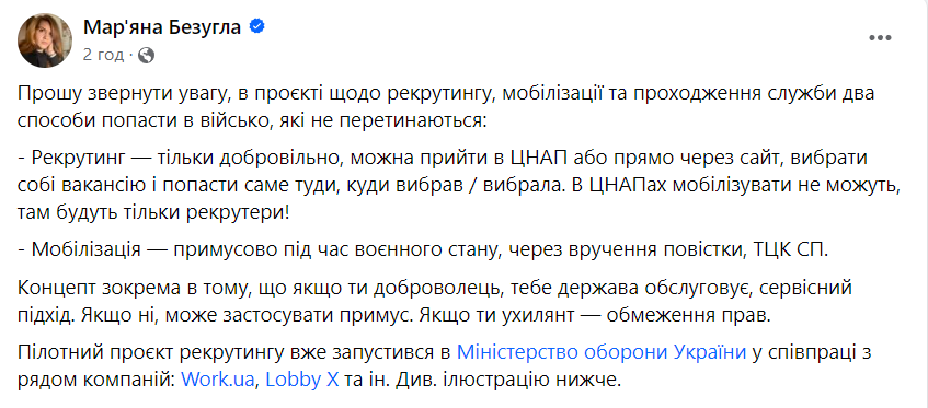 "Рекрутинг — тільки добровільно, можна прийти до ЦНАПу або через сайт, вибрати собі вакансію і попасти саме туди, куди вибрав/вибрала. В ЦНАПах мобілізувати не можуть, там будуть тільки рекрутери! Мобілізація — примусово під час воєнного стану, через вручення повістки, ТЦК та СП", — написала нардепка.